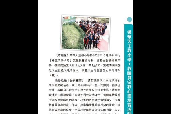 在聖誕節前夕,本校舉行「教職員靈修活動」,以「希望的傳承者」為主題。活動由祈禱揭開序幕,透過藝術靈修、分享會及聚餐,讓教職員在主內彼此扶持,共同體驗天主的愛與光明。周博士與羅神父的祈禱與降福,提醒我們在工作與生活中承擔使命,播種愛與希望。這…