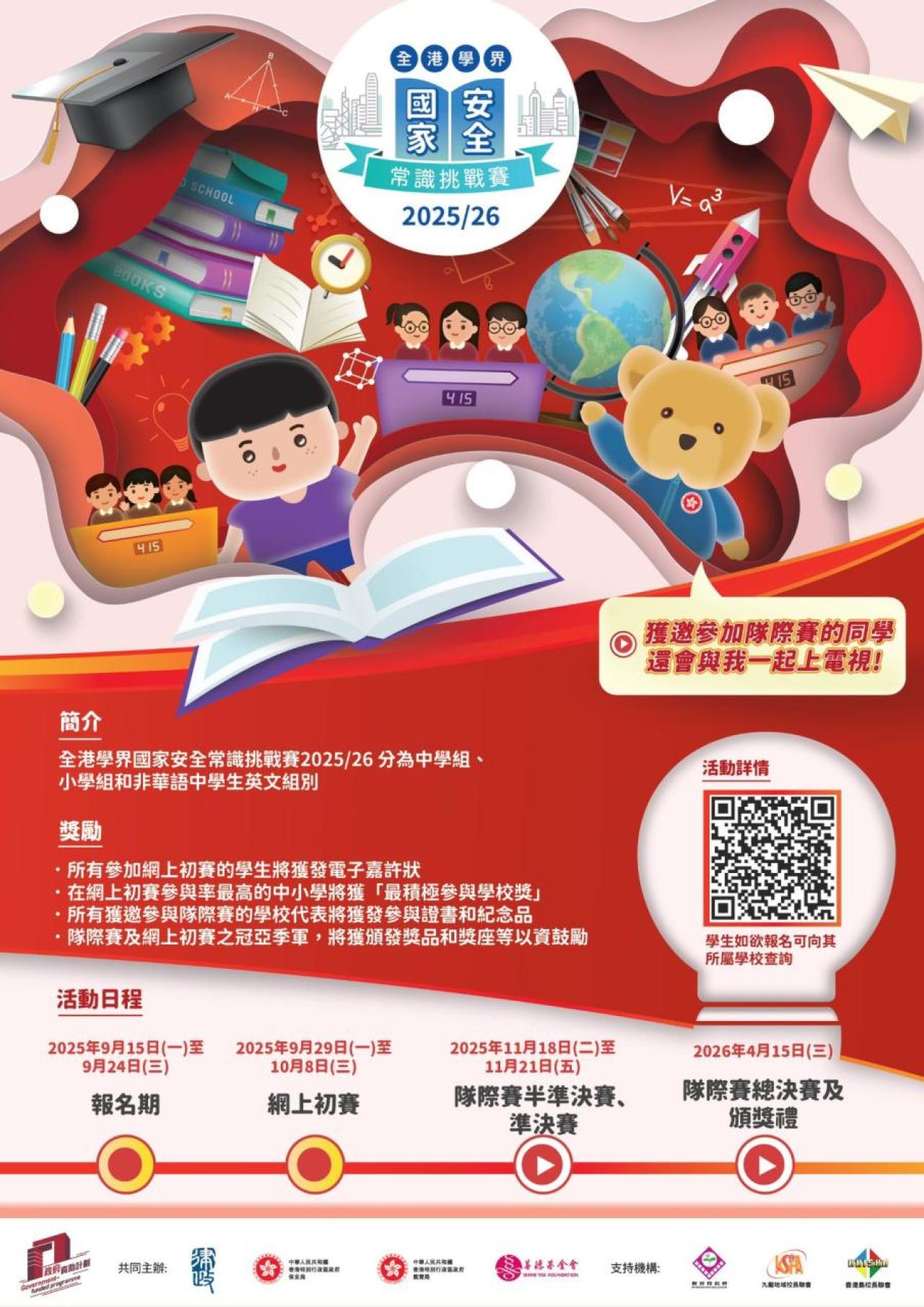 目的 | 為讓國家安全教育繼續植根校園,加強學生對國家安全的不同領域和法律的認識,包括國家《憲法》、《基本法》、《香港國安法》以及 《維護國家安全條例》,藉以提升他們維護國家安全的意識,同時配合每年10月1日的「國慶日」及4月15日的「全民國家安全教育日」,律政司、保安局、教育局及善德基金會在本學年繼續合作舉辦「全港學界國家安全常識挑戰賽(2024/25)」,鼓勵全港學生共同參與,營造維護國家安全的氛圍,凝聚維護國家安全的力量。 |