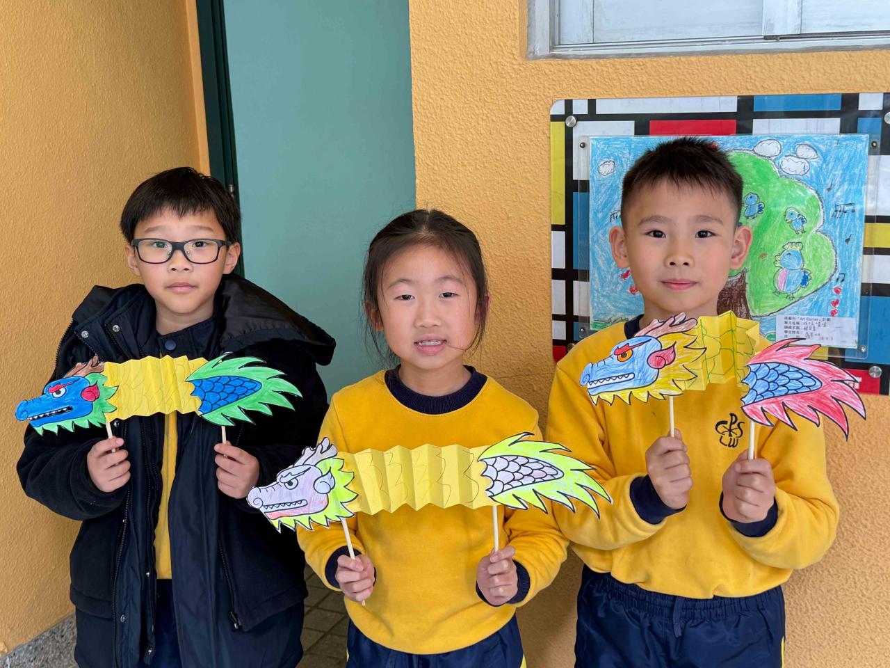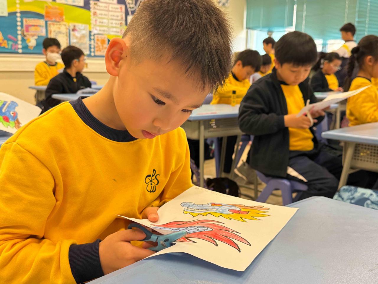 課堂上,老師先介紹了新年的傳説故事及其背後的文化含義。隨後,在老師的悉心指導下,同學們運用龍頭與龍尾圖案、彩紙及木筷子,一邊發揮創意塗上繽紛色彩,一邊認真剪裁與組裝。活動尾聲,隨着賀年音樂響起,同學們興奮地揮動手中的舞龍作品,互相祝賀,校園內洋溢著濃厚的新春喜慶氣氛。這次活動在他們心中播下了傳承文化的種子,更讓他們明白春節的由來及傳統習俗。