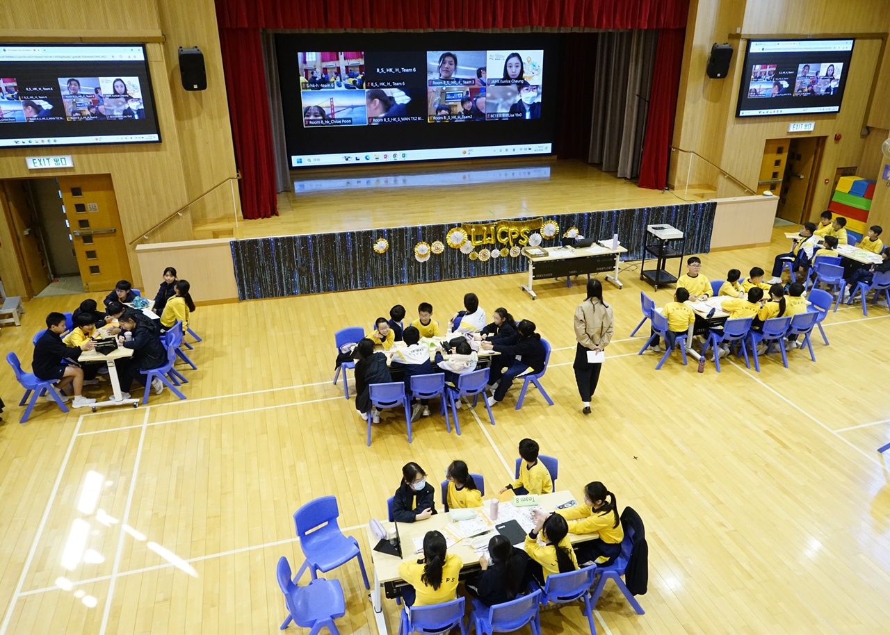 本校五年級參與了賽馬會成長「機」地計劃的學生於04-02-2026(三)齊集禮堂,參加了計劃下的線上環球創變提案日活動。同學們透過視訊會議,與來自中國內地、台灣、印尼、馬來西亞及菲律賓等地的近千名朋輩實時互動。這次活動不僅是技術上的連結,更是一個充滿歡笑、突破框框的「全球移動課室」,讓學生在輕鬆愉快的氛圍下實踐天馬行空的創意,共同探討自主創新的社區服務項目。