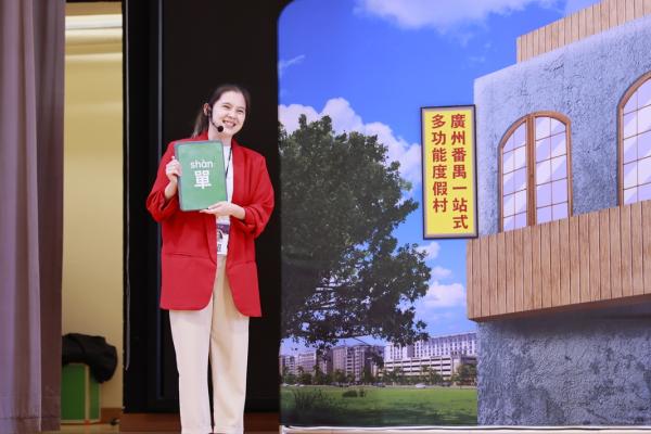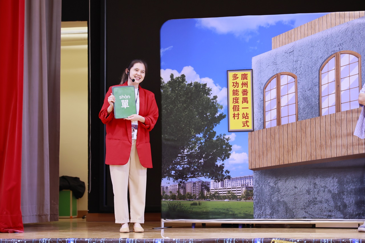 Professional actors used fluent Putonghua and humorous expressions to tell a story set in a Panyu resort. Students were fully engaged, following the actors to learn specific pronunciations and vocabulary. During the interactive sessions, students eagerly raised their hands to participate, showcasing their confidence on stage amidst a vibrant atmosphere.