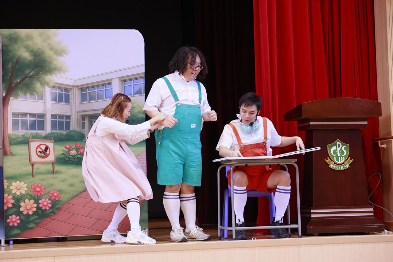 本學年試後活動期間,本校邀請了「紅白演義」劇團到校演出互動教育劇場——《迷途小神仙》。劇團以互動戲劇的形式,透過有趣的情境幫助學生分辨普通話的語音和詞彙。