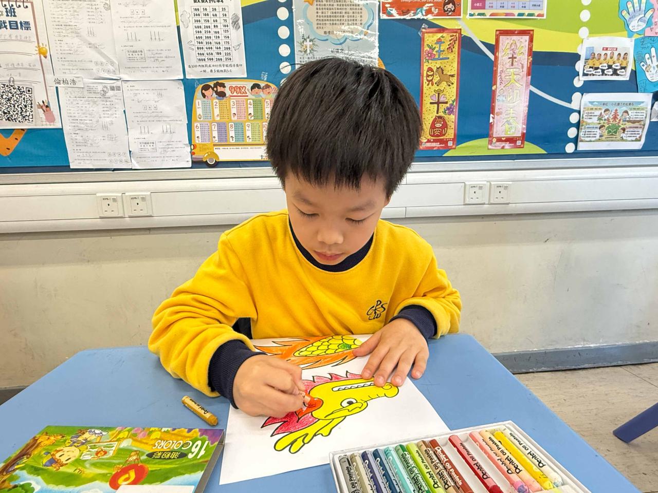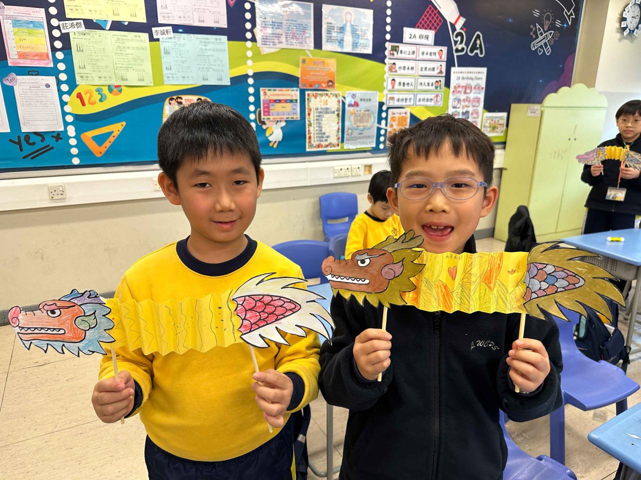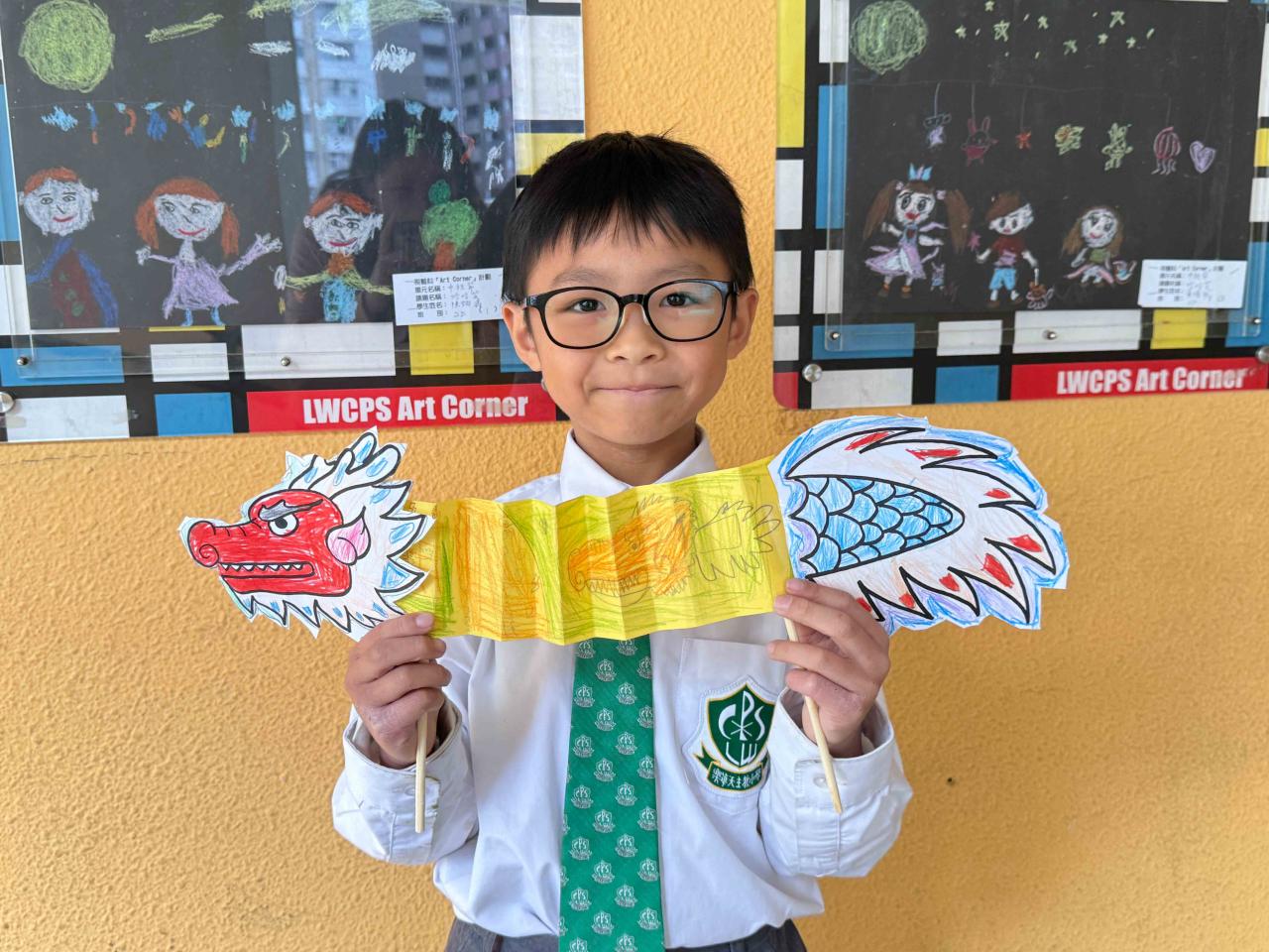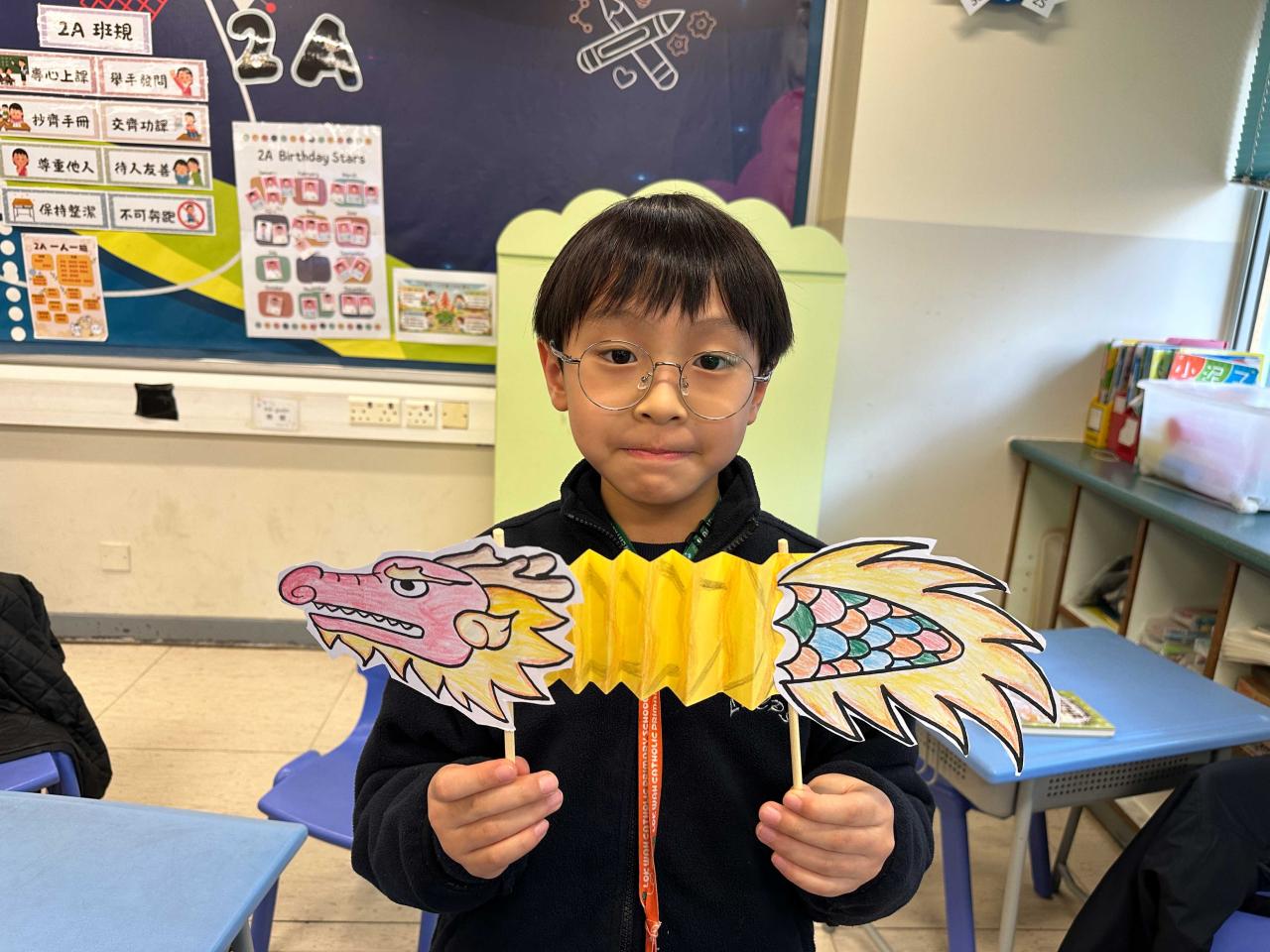 課堂上,老師先介紹了新年的傳説故事及其背後的文化含義。隨後,在老師的悉心指導下,同學們運用龍頭與龍尾圖案、彩紙及木筷子,一邊發揮創意塗上繽紛色彩,一邊認真剪裁與組裝。活動尾聲,隨着賀年音樂響起,同學們興奮地揮動手中的舞龍作品,互相祝賀,校園內洋溢著濃厚的新春喜慶氣氛。這次活動在他們心中播下了傳承文化的種子,更讓他們明白春節的由來及傳統習俗。