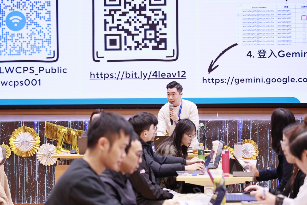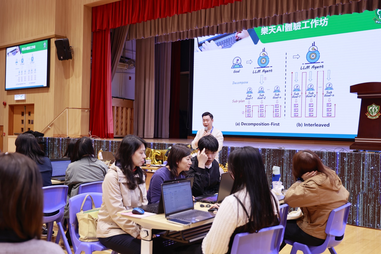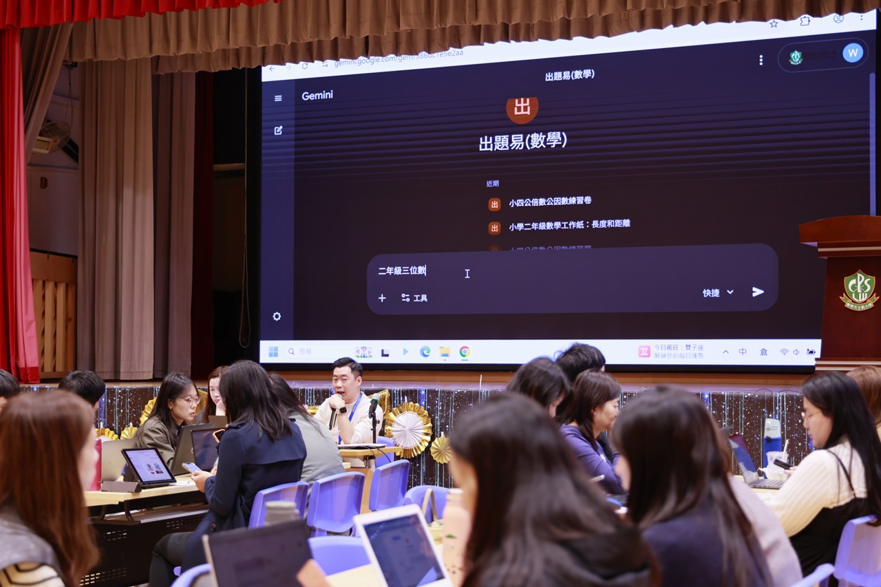 工作坊由本校黃嘉瑜主任及黃榮耀主任擔任主講。內容豐富充實,涵蓋了生成式AI在日常教學中的應用、如何利用AI工具減省行政程序及提升效率,並分享了多個學科的實踐案例。活動期間,老師們均帶備手提電腦或平板電腦進行即席實作。現場氣氛專注而熱烈,老師們積極嘗試不同的AI指令,探索如何將科技融入課堂,激發學生的學習興趣。