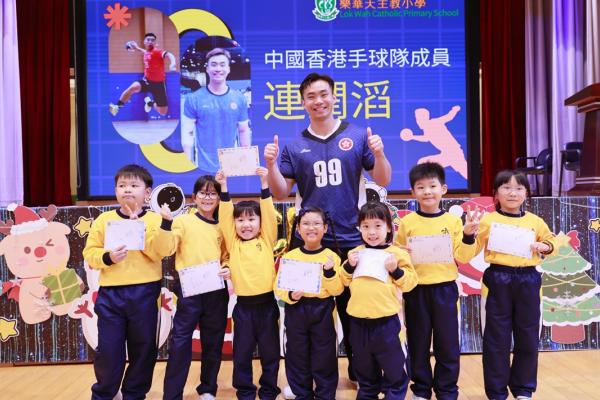 2025年12月9日,本校舉辦了一場別具意義的生涯規劃活動——「我們的校友:中國香港手球隊成員連潤滔分享講座」。當日下午,全校一至六年級同學齊聚禮堂,熱烈歡迎校友連潤滔先生重返母校。連潤滔早前代表中國香港手球隊出戰全運會,勇奪第四名,創下歷史佳績,其拼搏表現贏盡掌聲,是樂天大家庭的驕傲。