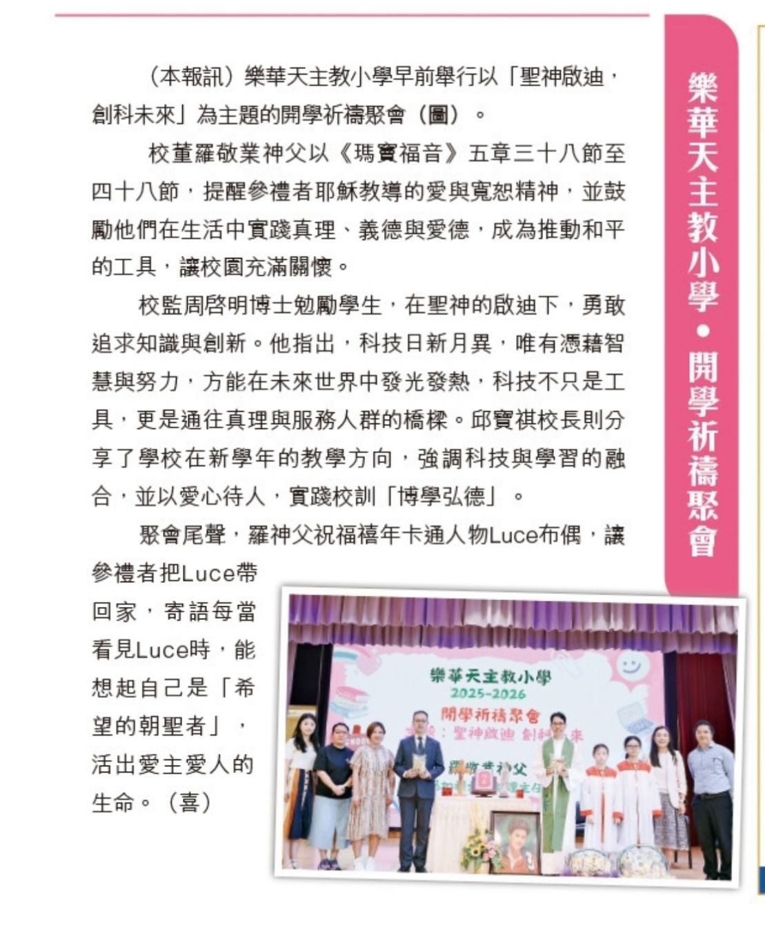 報章《公教報》《喜樂少年》樂華天主教小學開學祈禱聚會2025年9月21日