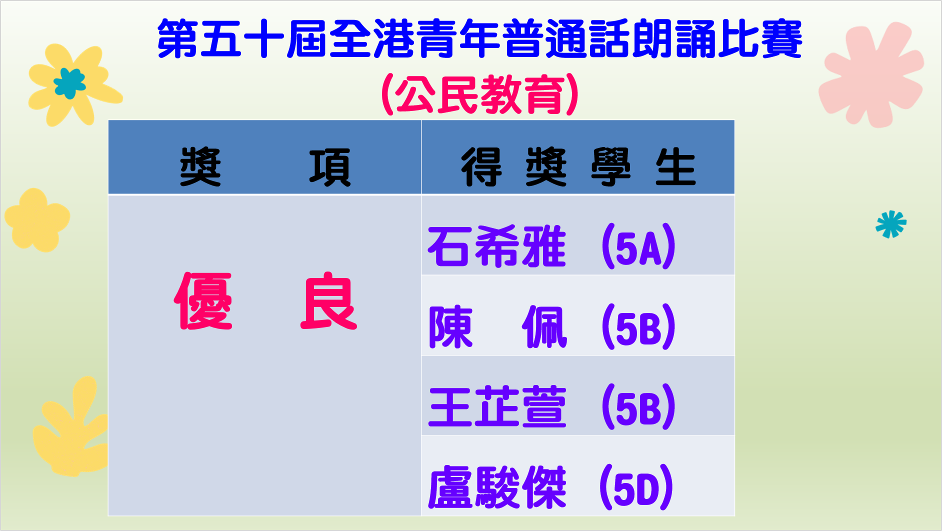 恭喜本校學生於「第50屆全港青年普通話朗誦比賽」獲頒優良獎!