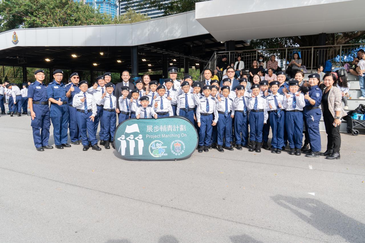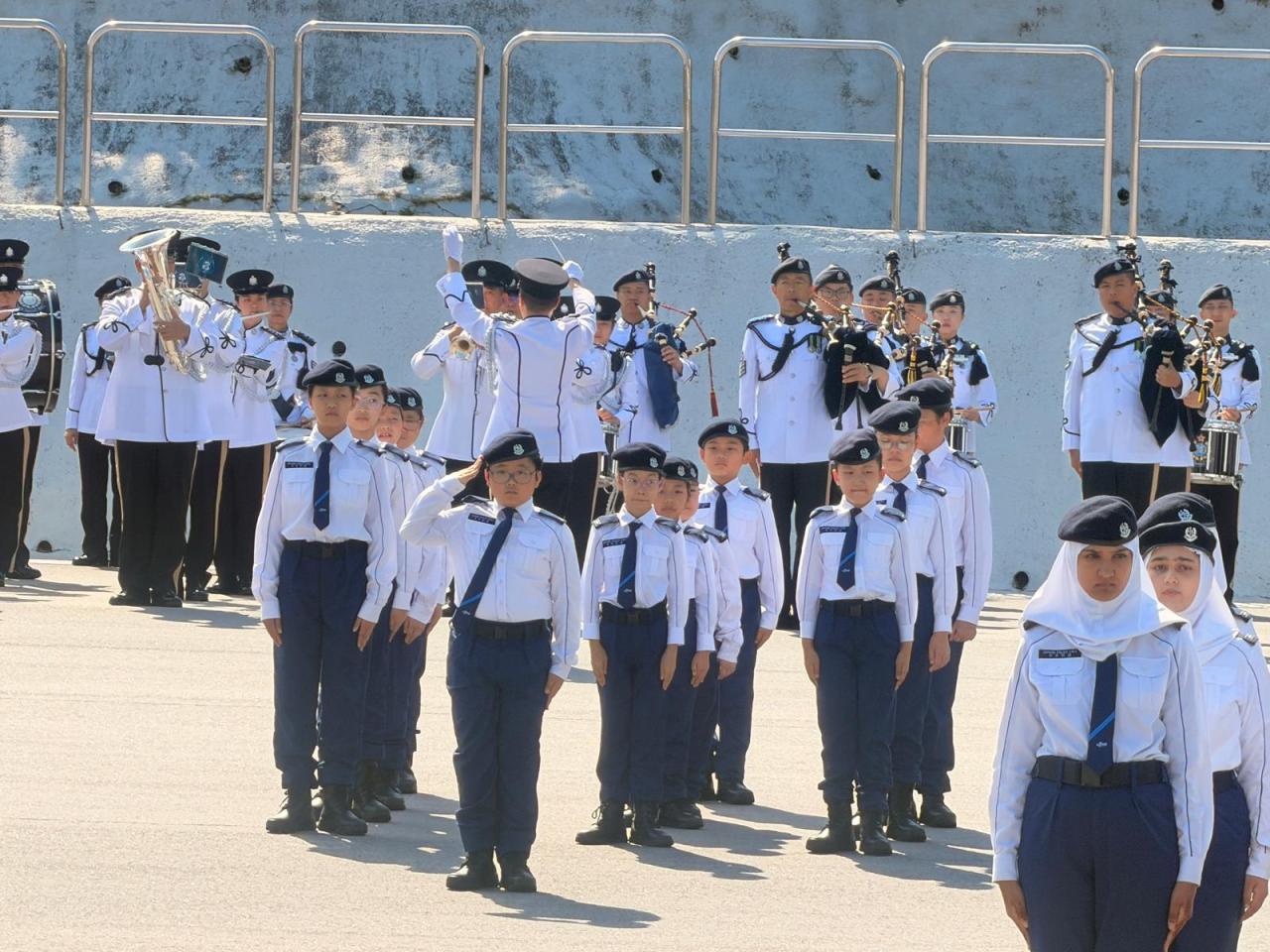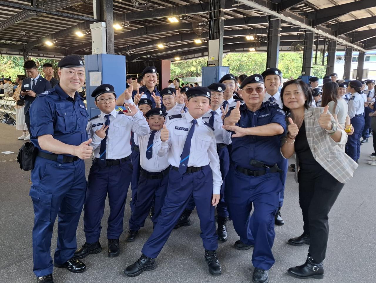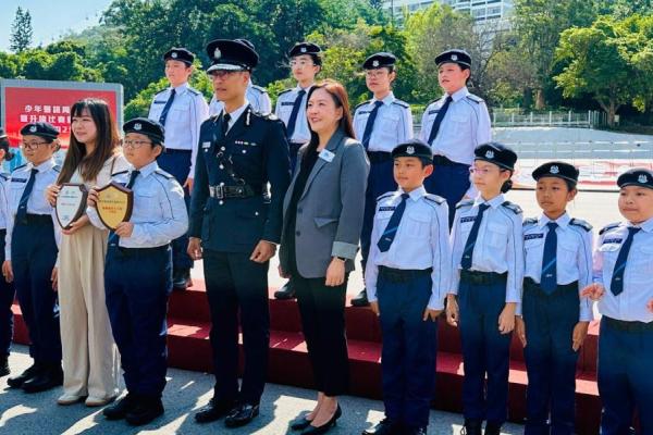 2025-11-02 11月2日,香港警察學院隆重舉行「周年會操暨升旗比賽頒獎典禮2025」。典禮由警務處長周一鳴先生擔任檢閱官。邱寶祺校長更親臨現場為樂天的升旗隊同學加油打氣!在莊嚴的儀式與激昂的國歌聲中,同學以鏗鏘有力的步伐、挺拔堅毅的身姿,展現出新時代青年的紀律素養與昂揚鬥志。步操賽場上,樂天同學憑藉全情投入的表現,榮獲「最積極投入小隊」殊榮,而6A洪耀銘同學更榮獲「小隊優秀隊員」。這些榮譽的背後,是同學們在一次次訓練中不畏艱辛、於烈日下揮灑汗水的堅持與付出!