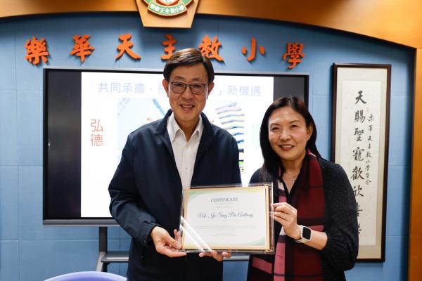 為配合國家推動愛國主義教育的重要方針,本校邱寶祺校長、陳志紅主任代表參加「抗戰勝利暨世界反法西斯戰爭勝利 80 周年」紀念活動,邱寶祺校長在「愛國主義教育協作夥伴計劃」啟動禮中,由教育局蔡若蓮局長JP頒發夥伴計劃獎座,以深化學校的愛國主義教育,培育學生的家國情懷為目標。