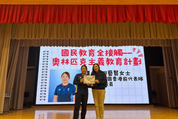 本校邀請港協暨奧委會「奧夢成真計劃」中國香港前獨木舟代表何藝賢女士分享運動員歷程及奧林匹克精神。她以幽默親切的方式講述26歲才發現獨木舟天分,鼓勵學生勇敢追夢,並強調「失敗係正常」、「唔好俾別人定義你」。